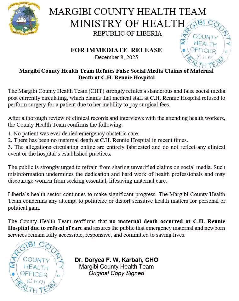 In an offiicial response to the report, the Ministry of Health through the Margibi County Health Team headed by Dr. Doryea F. W. Karbah, stated that it has investigated the team at the hospital and found no evidence of compulsory medical fees payment before catering for patients health.