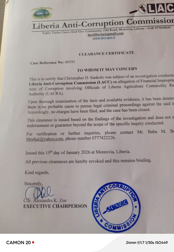 The decision by the Commission is contained in an official clearance certificate issued on January 15, 2026 under case reference number 00591 which confirms that Sankolo was the subject of an investigation into alleged financial impropriety and acts of corruption involving officials of the Liberia Agricultural Commodity Regulatory Authority.