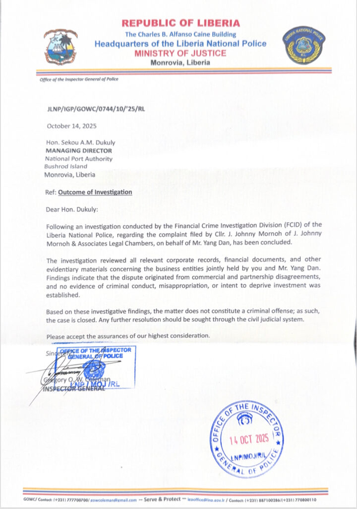 Monrovia, Liberia — October 29, 2025:A comprehensive investigation conducted by the Financial Crime Investigation Division (FCID) of the Liberia National Police (LNP) has cleared National Port Authority (NPA) Managing Director Hon. Sekou A.M. Dukuly of all criminal allegations brought against him by Chinese investor Yang Dan.