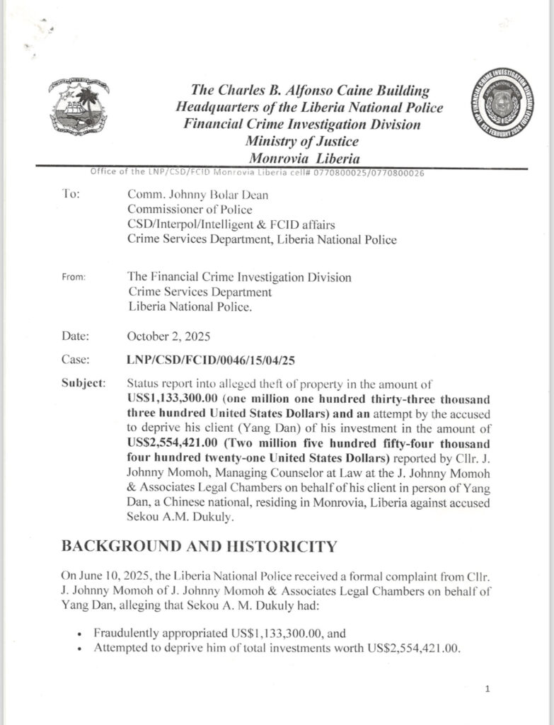 The investigation followed a complaint filed by Cllr. J. Johnny Mornoh of J. Johnny Mornoh & Associates Legal Chambers on behalf of Mr. Yang Dan, who accused Mr. Dukuly of mismanaging over US$1.1 million and depriving him of his investment interests in several jointly established Liberian companies, including Duke Global Investment Limited and A.M. Duke Investment Group. Mr. Dan also alleged that his vehicles and heavy-duty equipment were seized and that he was denied access to the A.M. Duke Water Plant located in PO-River, Bomi County.