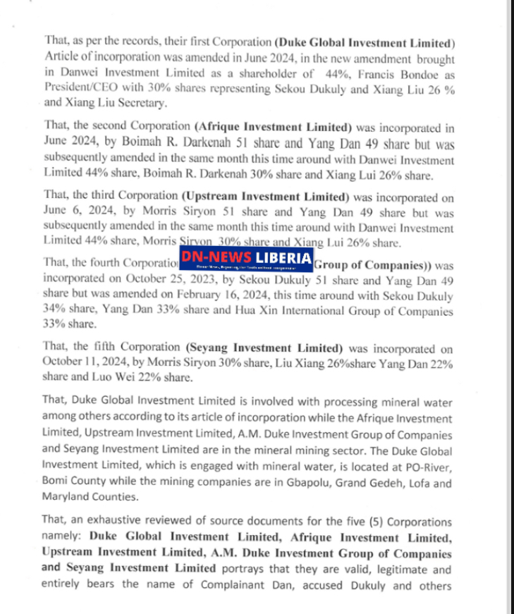 After months of reviewing financial records, incorporation documents, site visits, and consultations with the Liberia Revenue Authority and the Ministry of Mines and Energy, the FCID determined that both parties had jointly established five registered Liberian corporations. These included Duke Global Investment Limited, engaged in mineral water production in Bomi County; Afrique Investment Limited, focused on mineral exploration in Gbarpolu County; Upstream Investment Limited, a mining company in Lofa County; A.M. Duke Investment Group of Companies, engaged in mining in Grand Gedeh County; and Seyang Investment Limited, also in the mining sector in Maryland County. Each company was found to have legitimate registration records, with both Yang Dan and Sekou Dukuly named as shareholders alongside other Liberian and Chinese investors, including Francis Bondoe, Xiang Liu, Boimah Darkenah, Morris Siryon, Hua Xin International Group, and Danwei Investment Limited. The investigation established that Mr. Yang Dan remains a legitimate shareholder in all five corporations, with no evidence showing he had been removed or deprived of his shares.