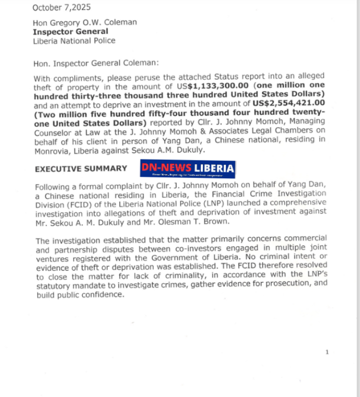 According to official documents obtained by DN News Liberia, the LNP concluded that the matter between the two businessmen was a commercial partnership dispute rather than a criminal case and therefore recommended no prosecution. The final communication to Mr. Dukuly, signed by Inspector General Gregory O. W. Coleman on October 14, 2025, stated that the investigation found no evidence of criminal conduct, misappropriation, or intent to deprive investment, effectively freeing Mr. Dukuly from all criminal liability.